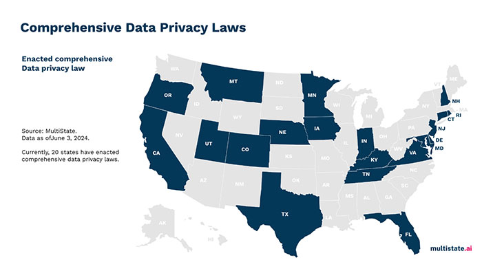 In summary, seven states have enacted new comprehensive privacy laws in 2024, increasing the total number of states with such laws to 20. This trend follows the pattern from 2023, during which eight states—Delaware, Florida, Indiana, Iowa, Montana, Oregon, Tennessee, and Texas—implemented comprehensive privacy laws. For a visual representation of all states with privacy laws, please refer to the map below.