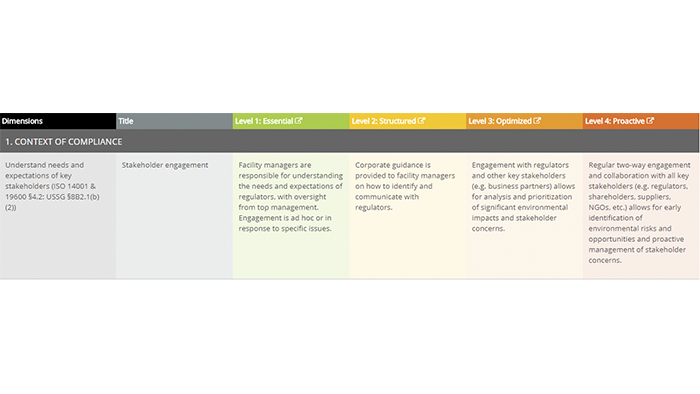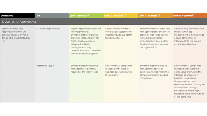 For all program levels, top management is responsible for compliance programs. For Essential Programs, responsibility is generally delegated to facility-level managers. Moving to the right in the matrix, programs increasingly have dedicated subject matter experts and managers with oversight across the organization.The other part of this dimension is for organizations to determine the scope of their compliance program. At the Essential Level, the scope is typically focused at the facility level while Proactive programs expand the scope with the goal of preventing disruption from compliance issues along the value chain.