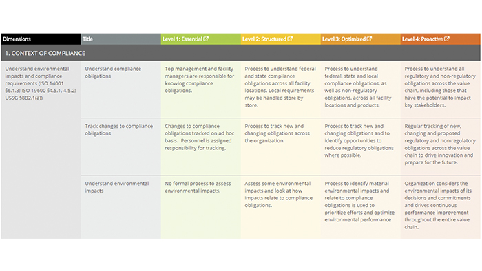 Essential programs generally only consider legal requirements and implement ad hoc programs for tracking and understanding requirements. As programs move across the matrix, they implement more comprehensive programs across the organization to track obligations and broaden their programs to include environmental impacts as well as voluntary obligations such as zero waste or greenhouse gas emission goals. Organizations at the proactive level try to predict requirements and reduce future obligations and environmental impacts.Today we are looking at the first dimension: The Context of Compliance.