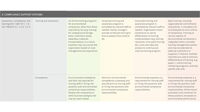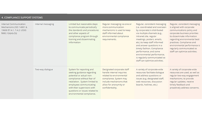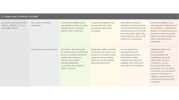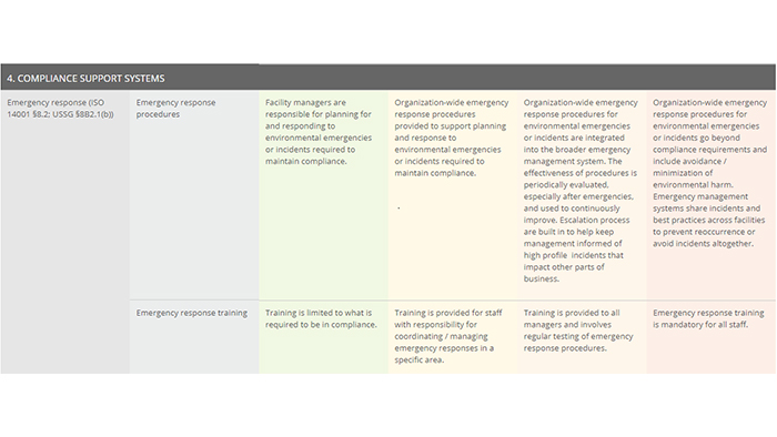 Compliance Support Systems—training, communication, documentation and emergency response— are elements that are needed for a fully functioning compliance program. For some, this means elements that are closely tied to legal requirements. For others, these areas can help them go beyond compliance to build systems that help reduce the potential for environmental harm and improve the organization’s sustainability.