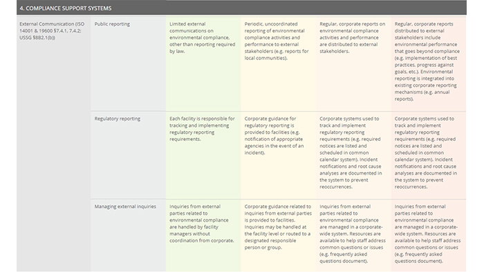 Internal communications keep staff informed about the company’s compliance program and legal requirements. Communication can be expanded to share information on compliance and environmental performance as well as best practices to give employees a greater ability to optimize operations. It is also important that companies provide staff with an avenue for getting guidance on compliance and for reporting issues.Dimension 16 | External Communication
