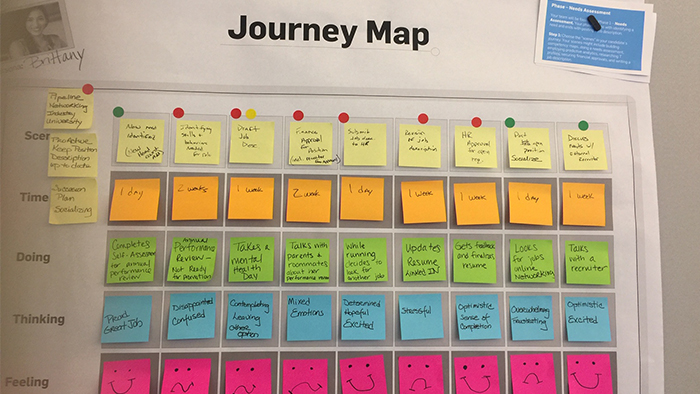 Each group was assigned one phase to discuss and map out the steps that a company would take during that phase and a timeline for each step. Then, the groups were challenged to view the process from the candidate’s perspective and highlight points where steps in that phase was working well and identify pain points or obstacles in the process. Once the groups finished mapping out each phrase, it was time for everyone to come together and view the entire journey map process from beginning to end. This led to a great discussion session as groups shared their maps and provided feedback on others.