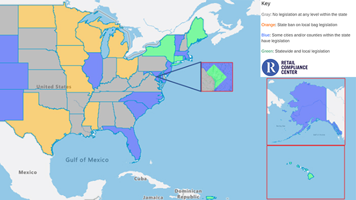 Effective August 1, 2019, retailers in Connecticut must charge a $0.10 fee for every single-use plastic bag provided to consumers.