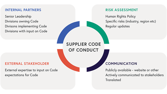 Supplier Codes of Conduct express a company’s requirements, commitment and aspirations and often act as a company’s human rights policy. Supplier Codes should be grounded in a company’s risk assessment and reflect a company’s values and actions.