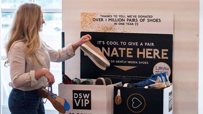 At DSW, customers can donate up to 20 pairs of new or gently-worn shoes to any store location and receive 50 DSW VIP Rewards points. To date, over 5 million pairs have been collected, keeping 6.25 million pounds of textiles from going to waste in landfills. Soles4Souls helps people in developing countries launch and sustain their own small businesses selling these donated shoes. Through this partnership, DSW drives traffic to their stores, customers are incentivized to donate with reward points, textiles are kept out of landfills, and entrepreneurs are able to lift themselves out of poverty.