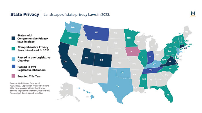 Last month Iowa became the first state this year to enact new comprehensive privacy legislation after Governor Kim Reynolds (R) signed SF 262. Since Iowa's signing, three other states have passed privacy legislation through two chambers, Indiana, Montana, and Tennessee. Assuming that the bills in Indiana, Montana, and Tennessee get signed into law, there will be a new total of nine states with comprehensive privacy laws in place, with the newcomers joining California, Colorado, Connecticut, Iowa, Utah, and Virginia. Refer to the map below for a snapshot of state privacy legislation so far in 2023.